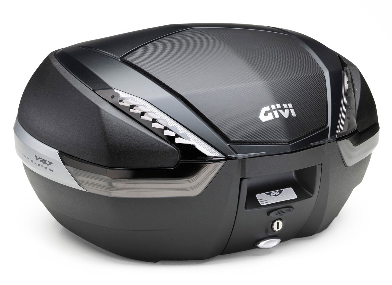 - Kufer Givi V47NNT (czarny, 47 litrów, szare odblaski, pokrywa karbonowa)