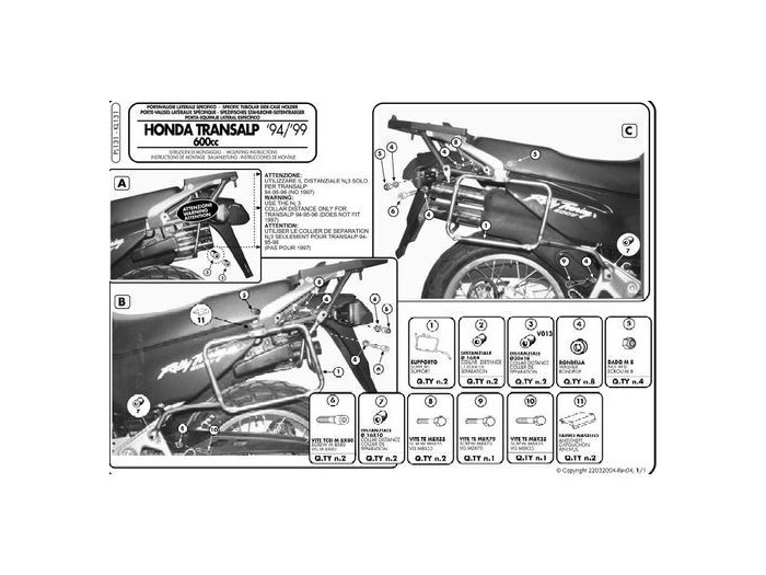 KAPPA STELAŻ KUFRÓW BOCZNYCH MONOKEY HONDA XL 600V TRANSALP `94-99 - RÓWNIEŻ POD KUFRY MONOKEY RETRO-FIT KVE K'VENTURE ALU ORAZ