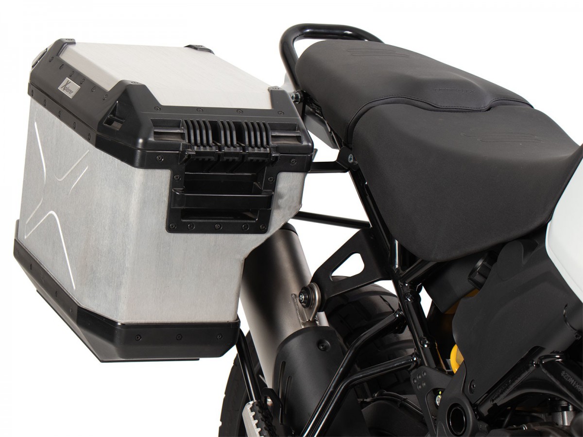 Wycięcie na bagażnik boczny w kolorze czarnym, w tym srebrne skrzynki boczne Xplorer do Ducati DesertX Rally (2024-)
