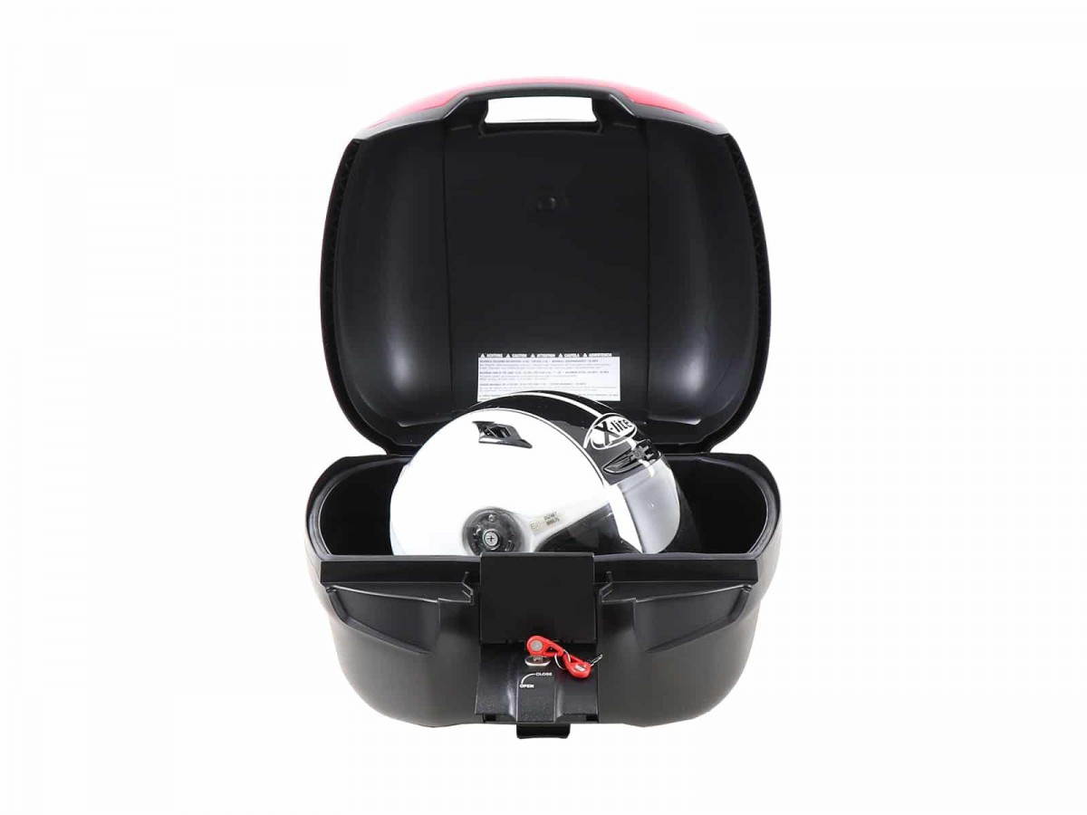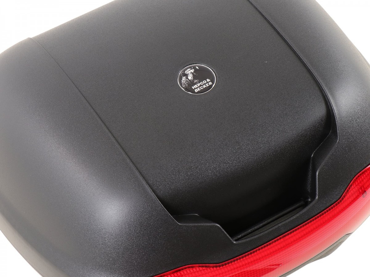 Kufer centralny Hepco&Becker Journey Topcase 40: czarny z czerwonym odblaskiem. mieści jeden kask, jest wodoodporny dzięki specjalnemu uszczelnieniu, skorupa kufra wykonana z niezwykle odpornego na uderzenia tworzywa sztucznego, pasuje do bagażników H&B Aluracks, Easyracks i Tube. Zalecane obciążenie: 5 kg do kufra centralnego (sprawdź informacje dotyczące konkretnego modelu bagażnika w celu uzyskania informacji o ograniczeniach). Dostępne oparcie, reling i torba wewnętrzna.
