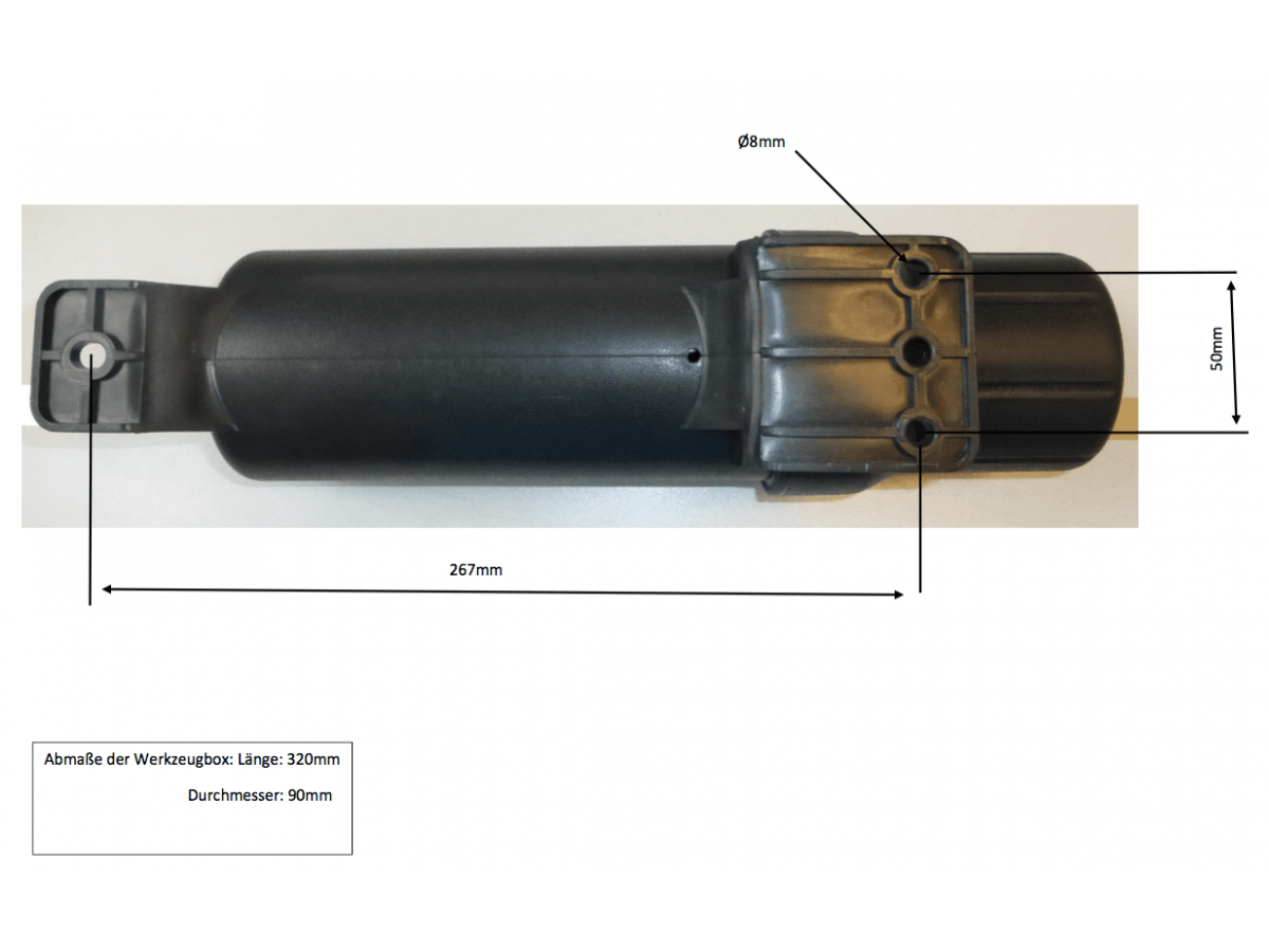 Wymiary wewnętrzne: 29 x 8 cm (długość / średnica) Wymiary: 32 x 9 cm Pojemność: 1,5 litra Montowany w zależności od modelu, wewnątrz bocznego bagażnika, aby wykorzystać tę przestrzeń Zestaw montażowy dostosowany do danego modelu Wodoodporna zakrętka Idealny do przechowywania narzędzi samochodowych, kamizelek bezpieczeństwa i podobnych przedmiotów.