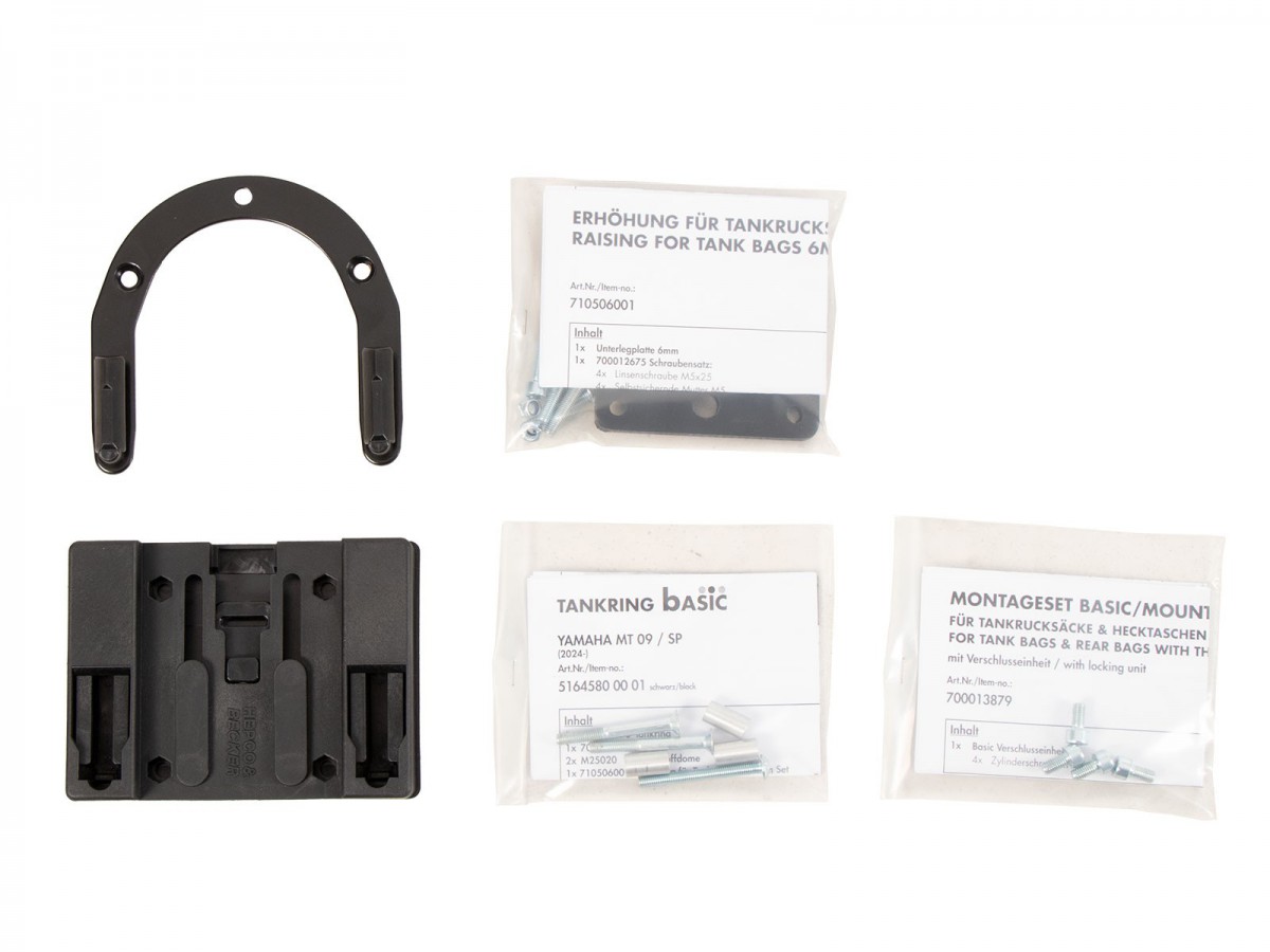 Prosty i innowacyjny w tym samym czasie - pierścień zbiornika BASIC Ten funkcjonalny pierścień zbiornika umożliwia zamocowanie torby na zbiornik firmy Hepco&Becker. Zakres dostawy obejmuje pierścień zbiornika BASIC, a także mocowanie torby na zbiornik, które można indywidualnie przykręcić do torby na zbiornik, w zależności od kształtu zbiornika i kąta kierownicy. Korek zbiornika można nadal otworzyć przy zamontowanym pierścieniu zbiornika bez żadnych problemów. Ogólnie rzecz biorąc, wszystko czego potrzebujesz to ten pierścień zbiornika i torba na zbiornik firmy H&B i masz wszystko, czego potrzebujesz. Każdy pierścień zbiornika specyficzny dla danego modelu jest przechowywany w bazie danych „Mój rower” dla odpowiedniego modelu motocykla. Jeśli pierścień zbiornika nie jest zapisany, możesz również skorzystać z listy kontrolnej tutaj w sklepie, aby ręcznie dowiedzieć się, czy uniwersalny pierścień zbiornika jest dostępny dla żądanego modelu. (Zobacz menu główne -> pierścienie na zbiornik BASIC)Charakterystyka:absolutnie bezpieczne trzymanie, nawet przy dużych prędkościachblokowanie mechanicznełatwa obsługatorbę na zbiornik Hepco&Becker wystarczy założyć i blokuje się ona słyszalnie na pierścieniu na zbiorniku dzięki wyrafinowanemu mechanizmowiodblokowywanie: mechanizm odblokowuje się za pomocą paska mocującego w kierunku jazdy z przodu torby na zbiornik; torba na zbiornik jest po prostu zdejmowanaprosta, ale skuteczna mechanikazalecana maksymalna prędkość z zamontowaną torbą na zbiornik: 130 km/h (proszę zwrócić uwagę na informacje producenta motocykla, a także informacje dotyczące konkretnego modelu w instrukcji lub tutaj z produktemzalecane obciążenie torby na zbiornik: ok. 3 kgW Niemczech systemy toreb na zbiornik nie wymagają ABE ani wpisu w dokumentach.Różnica między pierścieniami na zbiornik Lock-it i BASIC:Ogólna funkcja i działanie pozostają takie same. Jednak w porównaniu z pierścieniem na zbiornik Lock-it, pierścień na zbiornik Basic blokuje się tylko mechanicznie. Magnesy pierścienia na zbiornik Lock-it pomagają w centrowaniu. Różnica polega wyłącznie na dwóch magnesach lub plastikowych kopułkach, które są przykręcone do pierścienia na zbiornik. Rzeczywisty, specyficzny dla danego modelu „pierścień metalowy” jest taki sam dla obu wersji.Uwaga:Torby na zbiornik z uchwytem Lock-it nie można umieścić na pierścieniu na zbiornik BASIC i odwrotnie. Uchwyt torby na zbiornik i pierścień na zbiornik muszą pochodzić z tego samego systemu.