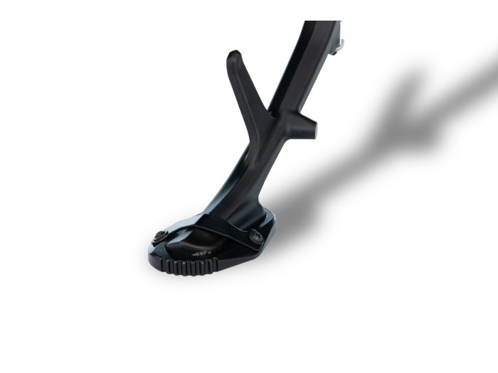 Dwuczęściowy powiększacz stopki bocznej zapewnia stabilne podparcie motocykla na każdej nawierzchni — także na gorącym asfalcie czy miękkim terenie — szczególnie przy pełnym obciążeniu