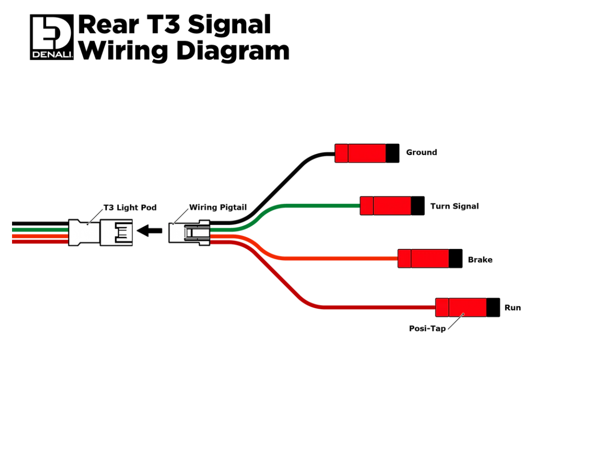 UWAGA: Tylnie moduły DENALI T3 NIE są obecnie kompatybilne z motocyklami BMW R1250GS/A lub R1300GS/A chyba że używane z DENALI CANsmart. Proszę zauważyć, że przy zasilaniu tylnych T3 przez CANsmart czerwone światło do jazdy pozostaje włączone pomiędzy miganiem bursztynowego kierunkowskazu. Jest to nieunikniony efekt zasilania T3 wyłącznie z CANsmart. Jeśli wolisz, aby światło do jazdy wyłączało się podczas aktywnego bursztynowego sygnału, po prostu podłącz przewody czerwonego światła do jazdy z modułów T3 bezpośrednio do przełączanego źródła zasilania w pojeździe (i ustaw obwód światła hamowania CANsmart tylko na hamowanie).