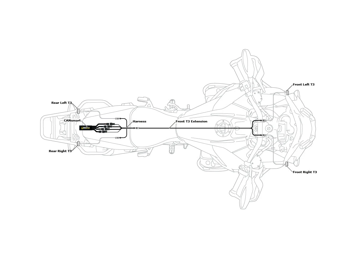 Kompatybilny ze wszystkimi kontrolerami GEN II DENALI CANsmart, nie jest konieczne żadne podłączanie przewodów ani inne modyfikacje, wystarczy podłączyć bezpośrednio do obwodów CANsmart, aby przesłać sygnały z kontrolera do świateł T3. Ten zestaw przewodów jest zaprojektowany do zasilania zestawu czterech świateł T3; dwóch tylnych T3 i dwóch przednich T3, ale może być również skonfigurowany do instalacji tylko przednich lub tylnych świateł T3.