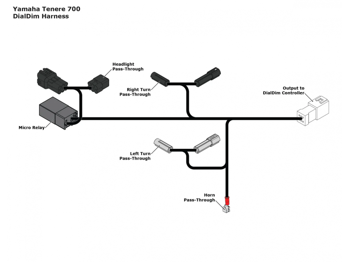 Ten adapter okablowania umożliwia połączenie typu plug-and-play pomiędzy naszym standardowym kontrolerem oświetlenia DialDim a Yamaha Tenere 700. Aby zainstalować, wystarczy podłączyć białe złącze do naszego kontrolera DialDim, a pozostałe złącza w linii przy reflektorze, klaksonie i kierunkowskazie Tenere 700 złącza sygnałowe.
