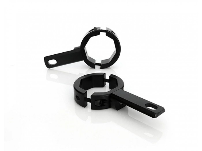 Ten zestaw do mocowania lampy z zaciskiem na kierownicę DENALI umożliwia montaż dowolnego zestawu oświetlenia LED DENALI na wewnętrznych rurach widelca motocykli lub dowolnej rurze o średnicy 39 mm–49 mm (1,6–1,875 cala). Te uchwyty do lamp mają unikalny ośmiokątny profil wewnętrzny, który pozwala zaciskom bezpiecznie chwycić rury o różnych średnicach i zawiera opcjonalną, w pełni obrotową półkę montażową, aby stworzyć niezwykle wszechstronne i solidne rozwiązanie do montażu lamp.
