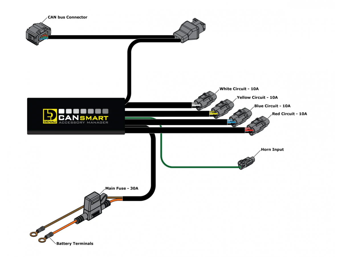 Cztery obwody CANsmart są wstępnie zaprogramowane do podłączenia i niezależnej kontroli dwóch zestawów świateł DENALI 2.0, klaksonu SoundBomb oraz naszego dodatkowego światła hamowania B6.