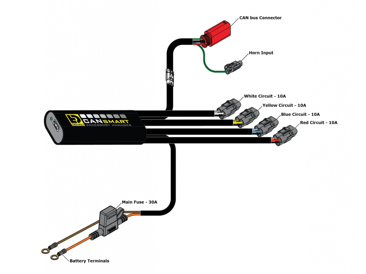 Cztery obwody CANsmart są wstępnie zaprogramowane do podłączenia i niezależnej kontroli dwóch zestawów świateł DENALI, klaksonu SoundBomb oraz naszego pomocniczego światła hamowania B6.