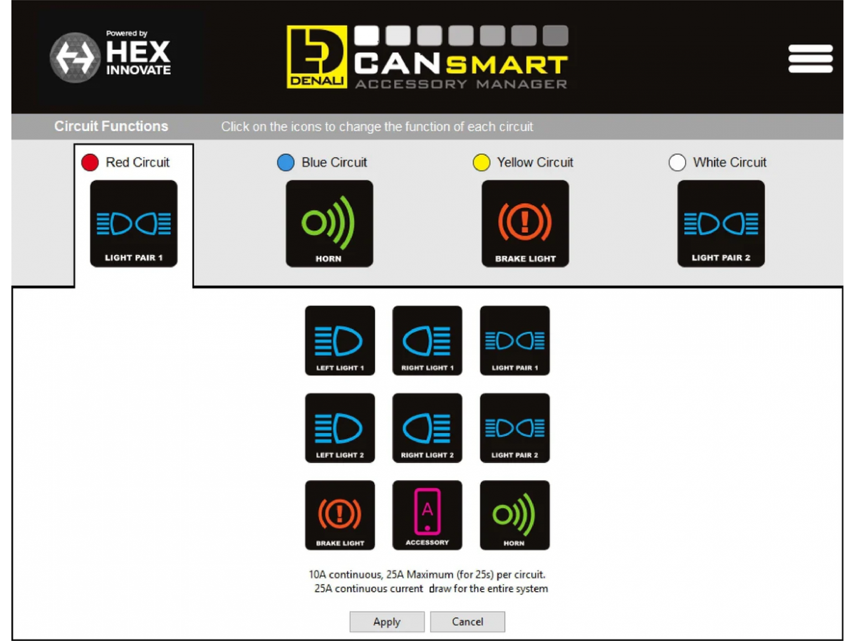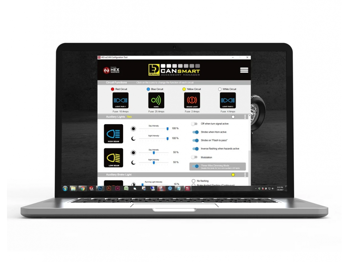 Cztery obwody CANsmart są wstępnie zaprogramowane do podłączenia i niezależnej kontroli dwóch zestawów świateł DENALI 2.0, klaksonu SoundBomb oraz naszego pomocniczego światła hamowania B6.