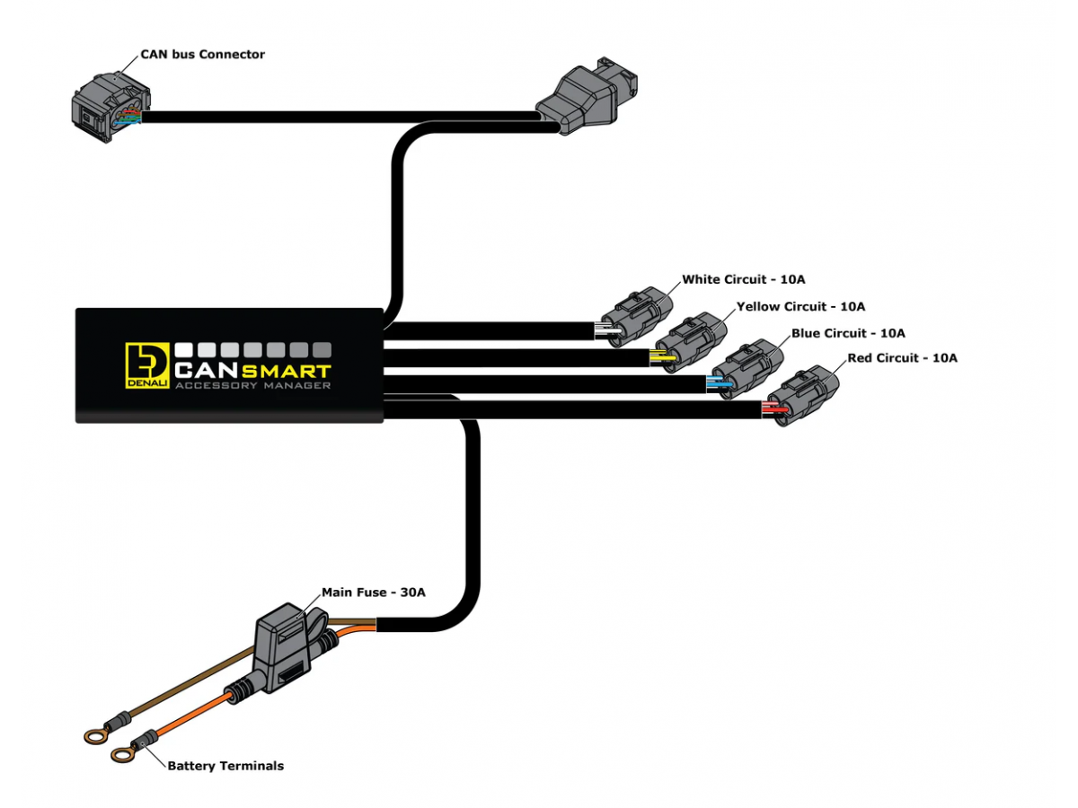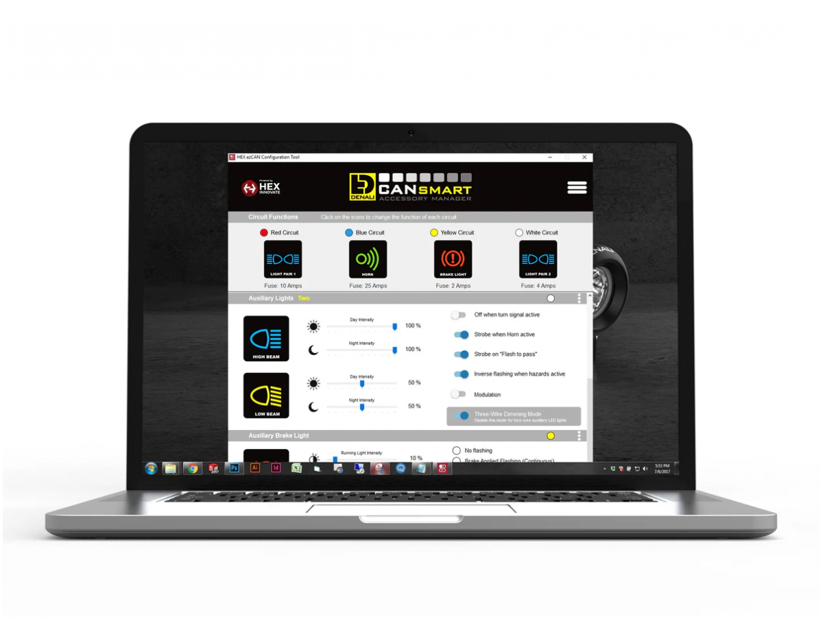 Cztery obwody CANsmart są wstępnie zaprogramowane do podłączenia i niezależnej kontroli dwóch zestawów świateł DENALI 2.0, klaksonu SoundBomb oraz naszego pomocniczego światła hamowania B6.