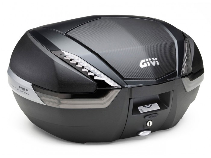 - Kufer Givi V47NNT (czarny, 47 litrów, szare odblaski, pokrywa karbonowa)